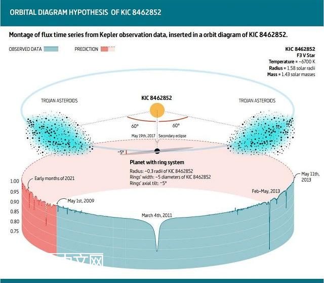 现在,西班牙的科学家又提出了一种全新的猜想——KIC 8462852周围环绕着一颗带环的行星,在行星的前方和后方还分别分布着两个小行星群。没错,这与太阳系中的木星和特洛伊小行星群很像。显然,这个以观测结果反推的猜想能够很好地解释KIC 8462852的各种亮度下降情况。