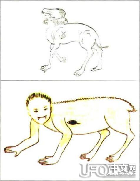 根据《山海经》描述所绘制的两版“狍鸮”简图关于饕餮的历史记载很多,《神异经·西荒经》中有云:“饕餮,兽名,身如牛,人面,目在腋下,食人。” 《山海经·北山经》也有云:“钩吾之山其上多玉,其下多铜。有兽焉,其状如羊身人面,其目在腋下,虎齿人爪,其音如婴儿,名曰狍鸮,是食人。”根据晋代郭璞对《山海经》的注解,这里说的狍鸮(páo xiāo)即是指饕餮。