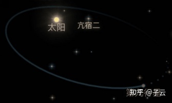 目前它在远日点上。它的近日点就在太阳系前进的那一面方向上,也就是地球北半球夏季黄道的大概位置的上方(7月初)。其实在宇宙中也没有上下,咱们姑且名之上下,暂将相对于黄道面的太阳运动方向定为“上”吧。