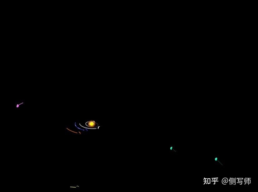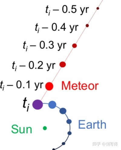 我们用太阳、八颗行星和流星初始化模拟,地心速度矢量(vxobs,vyobs,vzobs)=(-3.4,-43.5,10.3)km/s,在撞击时高度为18.7公里,时间为2014年1月8日17:05:34 UTC,和CNEOS目录报道的一样。然后,我们使用IAS15追溯流星的运动(Rein & Spiegel 2014)。这没有考虑到空气阻力、相撞的几何形状还有空气阻力,这都会导致更高的撞击速度,因此也会导致日心速度偏高。Siraj & Loeb(2022年)加入了空气阻力导致的放缓。
