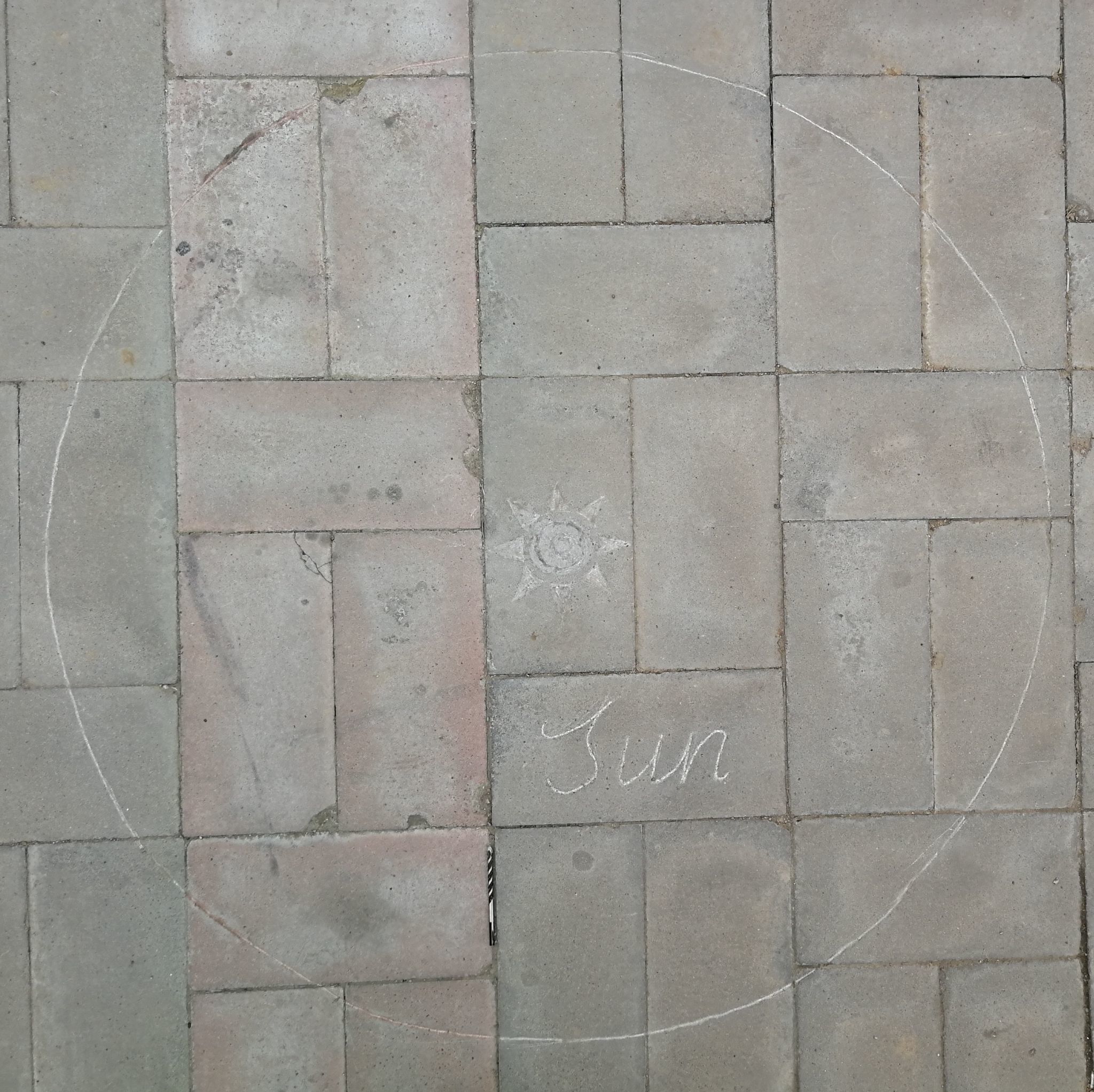 先把太阳位置确定到所在汝州东区马路边的人行道上,为便于定位在地面按尺寸刻出图形:
