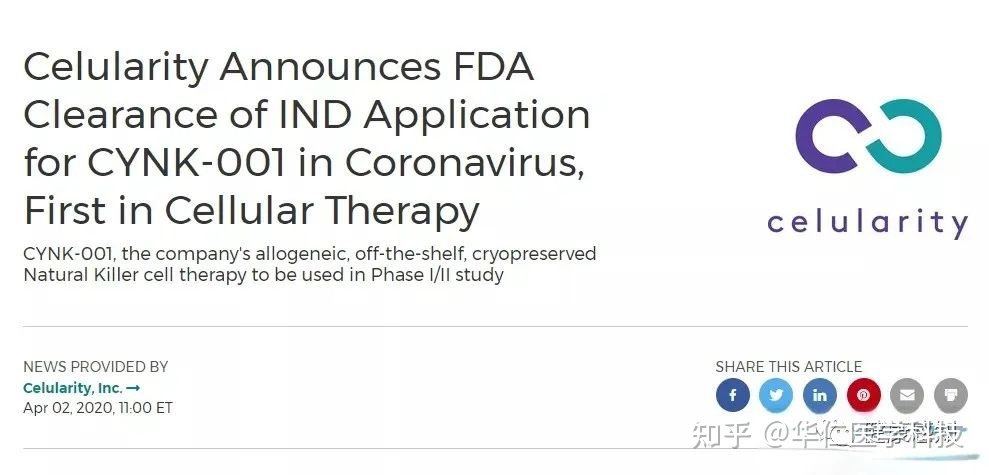 美国生物技术Celularity公司的NK细胞疗法CYNK-001,是首个获得FDA批准在COVID-19成年患者开展临床试验的细胞免疫疗法。该公司开展了I/II期临床研究,研究入组86名COVID-19患者。
