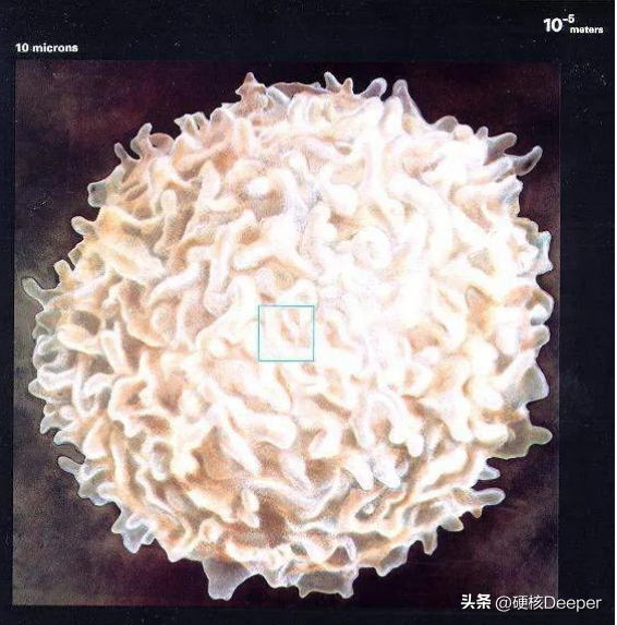 我们在皱褶的淋巴细胞内,看到了细胞核细胞内的保护膜,每一个完整的细胞都有这样一个细胞核,其分子产物制造了细胞的整个生命,一个人体内的细胞比银河系中的行星还多一百倍。