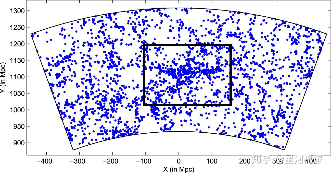黑框:Figure 3, Bagchi et al.(2017) SDSS巡天发现的Saraswati超星系团结构,延展200Mpc。