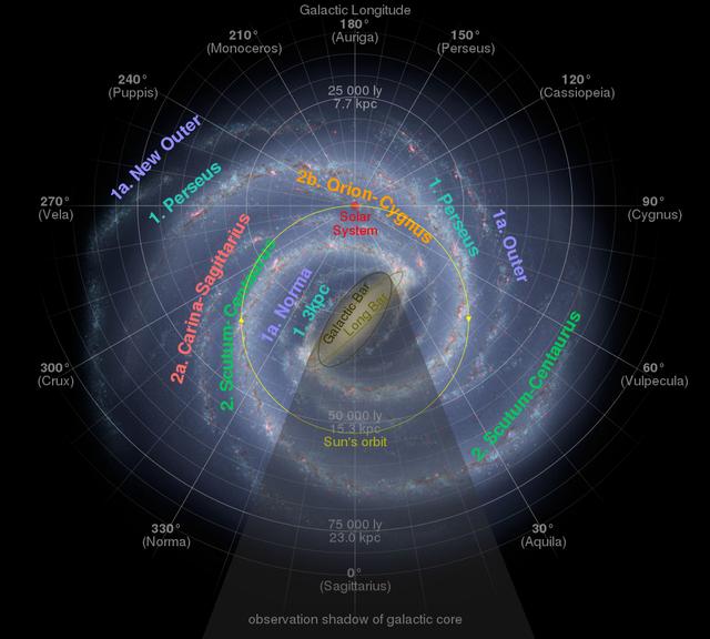 图解: 太阳系在银河系内的位置,以黄色的箭头标示。