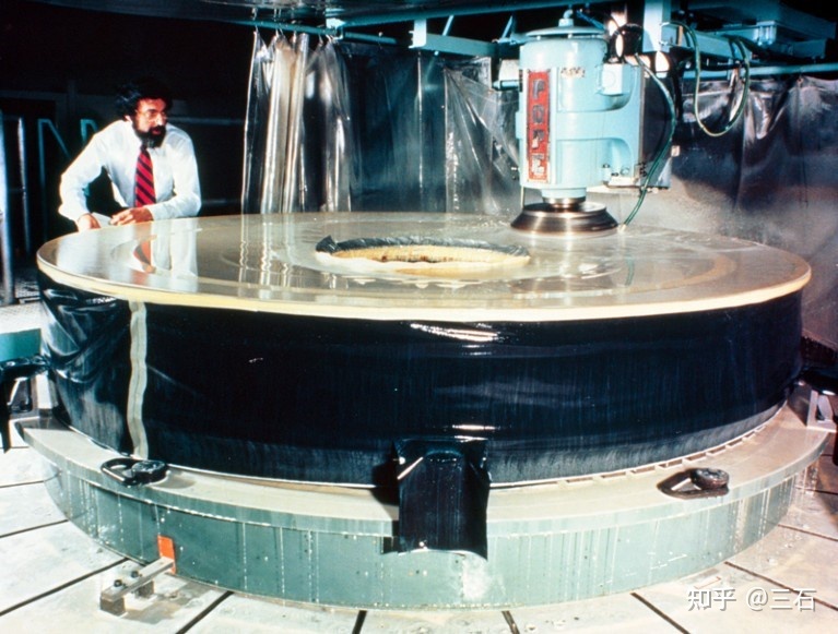 在这张几十年前的照片中,一台机器正在制造哈勃的主镜;最终将在镜子中发现一个缺陷,这需要宇航员飞到天文台附近并安装矫正光学系统。