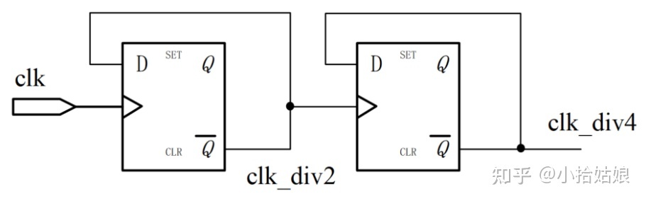 - 偶数分频——占空比为50%:采用触发器反向输出端连接到输入端的方式,可构成简单的 2 分频电路。以此为基础进行级联,可构成 4 分频,8 分频电路。电路实现如下图所示,用 Verilog 描述时只需使用简单的取反逻辑即可。
