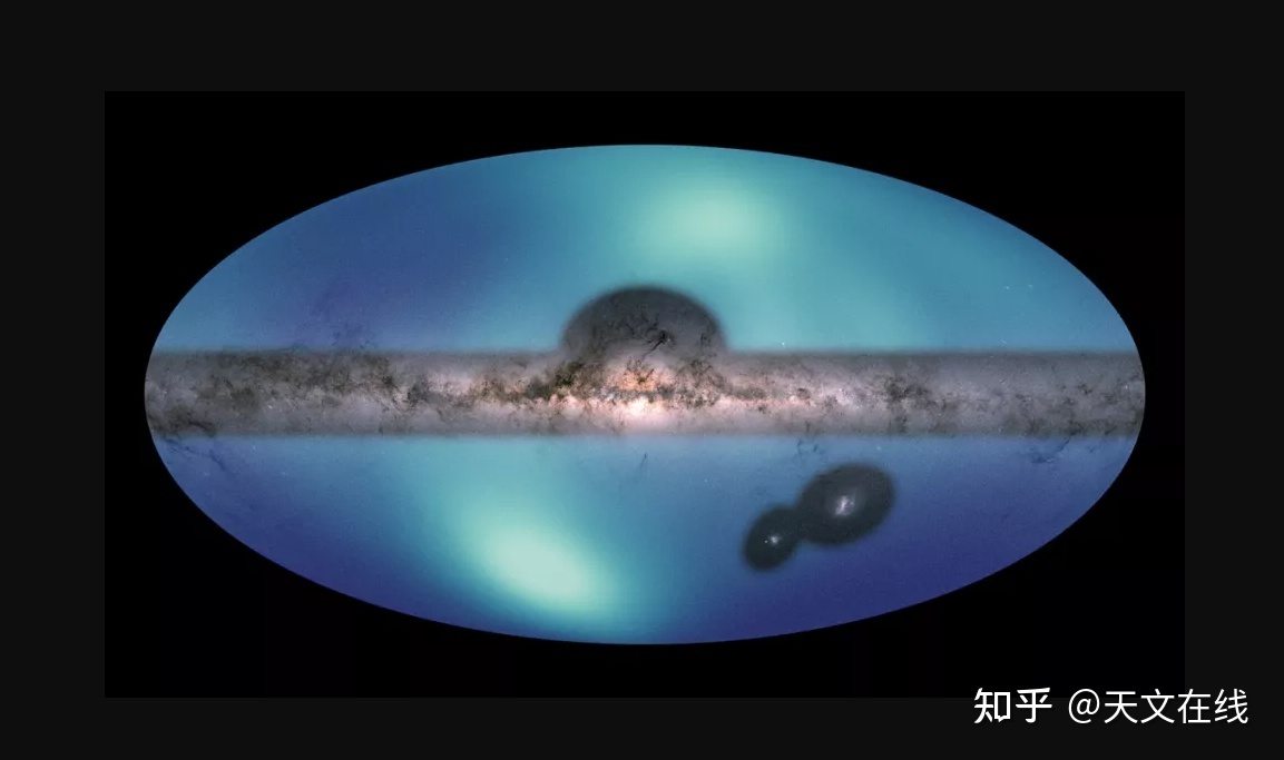这一星空图是根据美国航天局以及欧洲太空署的天文望远镜获取到的数据绘制而成。除了展示银河系光环周围的景象,它还提供了一些预测银河系未来的关键视角。当大型麦哲伦云绕银河运行时,银河系光环里的暗物质产生的重力会减缓其运行速度,从而使大型麦哲伦云不断划入越来越小的轨道中,随着麦哲伦云持续靠近银河系,两个物体最终会发生碰撞。这一结果大概会在20亿年后发生。