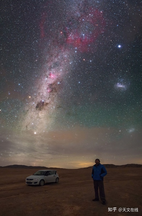 图:图片展示了银河系光环下方的明亮区域,即恒星光束。右下方即绕轨道运行的大型麦哲伦云。