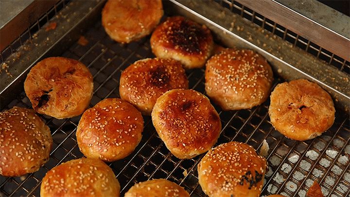 金华酥饼的店面平平无奇,但扑鼻而来的饼香味让人走不动道。刚出炉的酥饼冒着热气,表面金黄酥脆,再缀以星星点点的白芝麻。梅干菜和肉作为内馅,分辣和不辣两个口味。