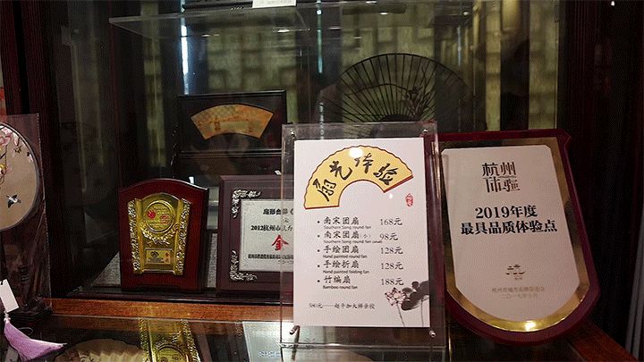 店主赵平加女士,是非物质文化遗产——杭扇的代表性传承人。店里的扇子从扇骨制作到扇面绘写,全部都是手工完成的,工艺都很精良,价格几十到几万不等。