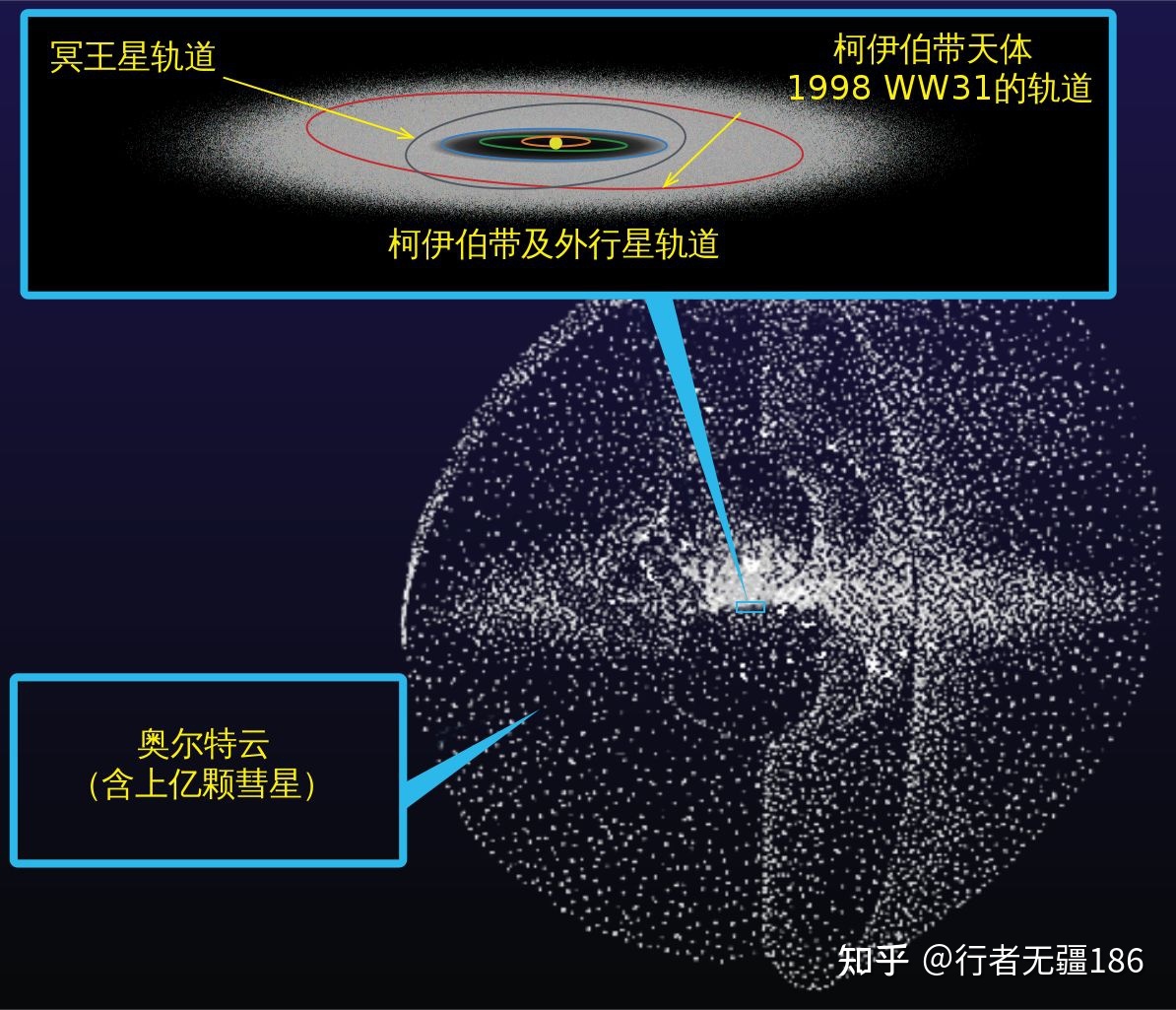 太阳系到底有多大呢?很多人以为太阳系第大八大行星海王星的轨道就是太阳系边缘了,其实离太阳系的边缘还早呢!海王星轨道以外是柯伊伯带,柯伊伯带以外是奥尔特云。这还只是我们已探测到的,奥尔特云以外是否就能完全脱离太阳系影响,也并没有什么科学定论,毕竟离我们太遥远了,我们的观测能力还达不到。