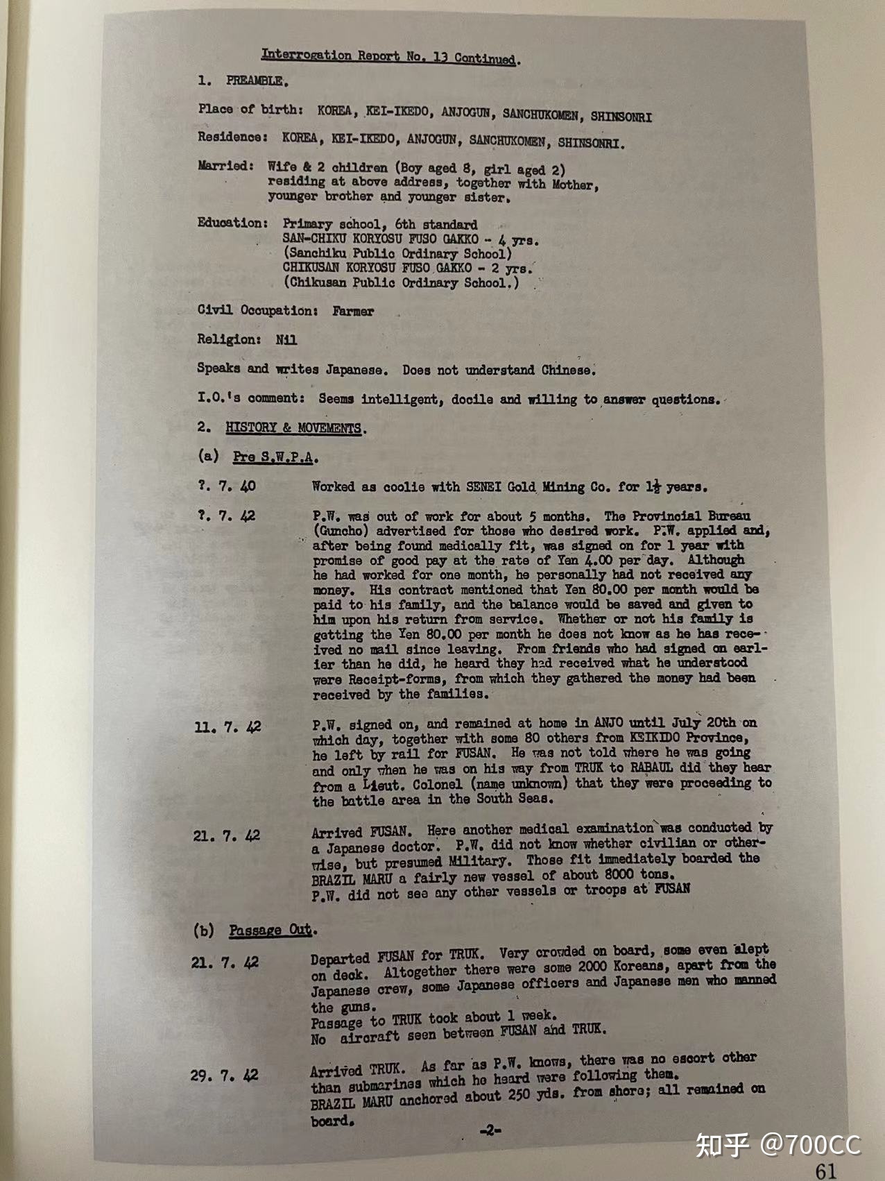 背景:1942年7月,麦克阿瑟在西南太平洋战区司令部设立了盟军翻译处(Allied Translator and Interpreter Section),该机构设立之初致力于翻译缴获的日军资料,并为盟军问询战俘提供口译服务。这是盟军翻译处审讯的第一个朝鲜籍日本战俘。