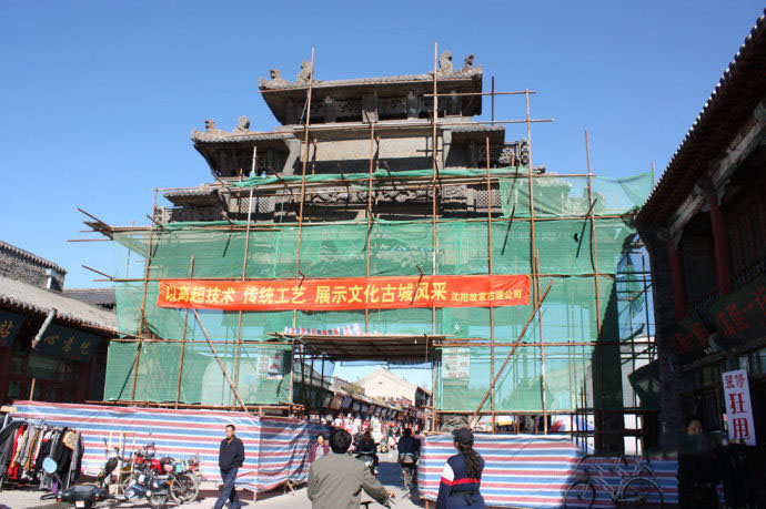 我们是上周五上午经过四个多小时的驾驶,九点半抵达兴城。进入古城后,随便拍了几张城门楼,就径直奔向钟鼓楼,因为那两座牌坊就坐落在对着的那条街上。当走近牌楼一看时,眼前的场面让我大失所望。整个石坊被脚手架和护网围了起来,上面有工人在对文物进行保护性破坏。拍照是不可能了!失望之中往前一看,万幸,另一座牌坊没有施工,而且是祖大寿的,万幸啊!我此来兴城不为别的,就是看祖大寿的牌坊。这其中的原因固然有对其人其事的兴趣,更是因为祖大寿的整座墓(除地宫)在民初就被洋人拐到加拿大去了,留给我们的只有这座明廷为表彰祖大寿功绩而立的旌表牌坊。