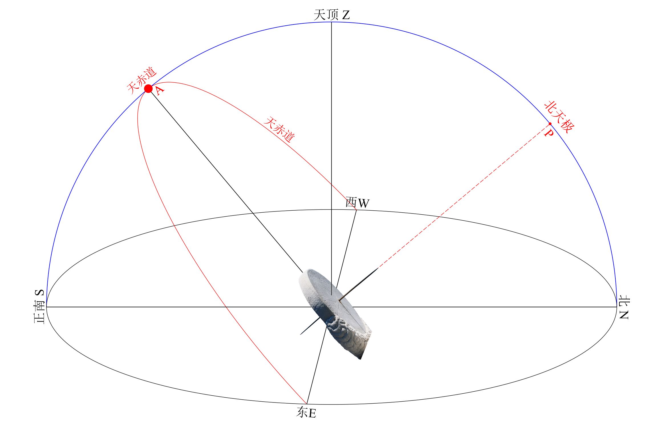 面向正南,从头顶(天顶)向正南倾斜一个特定角度就是天赤道,而这个特定的角度值就是我们生活城市的纬度值(A-Z之间的角度值)。日晷,天文学中最重要的天文仪器,可不仅仅只是一个计时工具,日规就是倾斜对准天赤道的。只有倾斜对准天赤道,等分的刻度才能将时间等分。参考:【二. 时间--真太阳时】