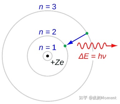 在玻尔模型里,被约束于原子壳层的带负价电子,绕着带正价原子核进行圆周运动。从一个轨道跃迁至另一个轨道会伴随着离散能量以电磁波的形式被发射或吸收。在图中,电子的轨道显示为灰色圆圈,其半径随着主量子数平方n2增加,从主量子数3 → 2的跃迁制成了巴耳末系的第一条谱线,波长为656 nm (红光)。