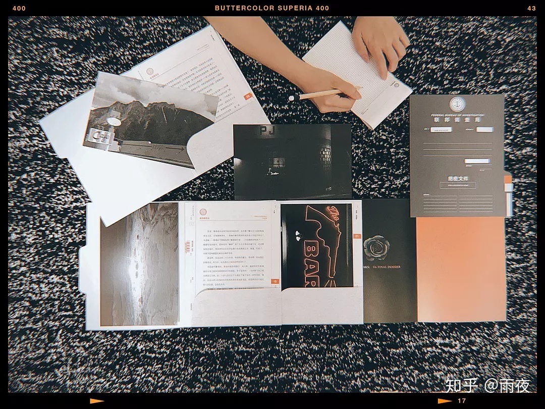 档案夹里面做旧的档案文件,全部汉化为中文,局部暖红专色印刷。