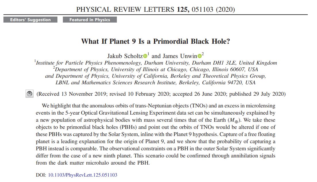 反正也还没找到,于是也有天文学家提出可能这个“质量块”根本就不是什么行星,也可能是个黑洞啊~这一结果发表于2020年7月的PRL。