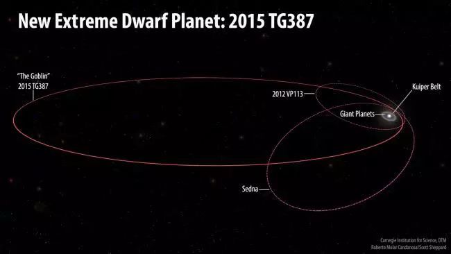 今年10月,Sheppard团队宣布新发现了一颗距离太阳约80个天文单位(AU)(1个天文单位相当于1个平均日地距离)的小天体2015TG387,轨道也有聚拢趋势…这颗天体昵称“The Goblin”(哥布林,一种传说中的鬼怪),因为它第一次被观测到是在快到万圣节的时候[6]。