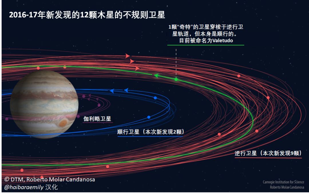 新发现的12颗木星不规则卫星分布,注意新发现的Valetudo是以字母o结尾的,用于表明它是木星的不规则卫星中轨道特立独行的一类。来源:卡耐基科学研究所/Molar Candanosa[5]