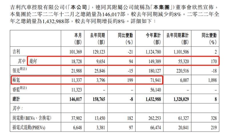 据了解,目前整个吉利体系内,其新能源板块的销量支撑主要依靠于几何和极氪两品牌。数据显示,2022年极氪品牌销量约为7.2万辆,并连续多月交付过万。即便如此,极氪旗下产品与新能源头部热销车型仍有不小的差距。而成立较早的几何品牌虽最初定位高端,但却未能抓住先发优势,市场表现不温不火。进入2022年,几何对品牌定位进行了重新梳理,明确了走“大众化”的纯电路线,销量开始有所好转。数据显示,2022年几何品牌销量约15万辆,同比增长170%。