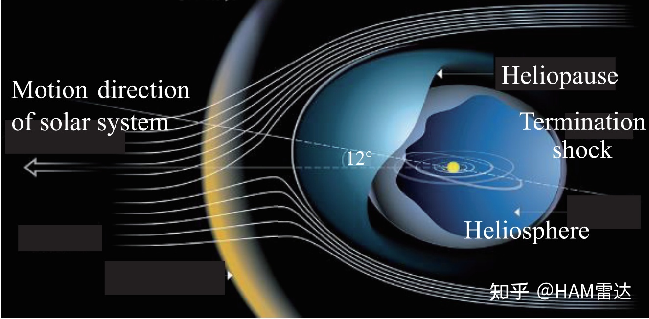 地球有磁层、电离层等结构保护着地球上的生物免受来自太阳以及宇宙的高能粒子以及射线的伤害,同样对于太阳而言,在太阳系的边际,有一个由日球层顶和终止激波构成的日球层边缘区域。日球层是指太阳风在银河系星际空间中吹出的巨大磁化等离子体“气泡”,气泡的外边界是日球层顶,也就是太阳风和星际等离子体的交际面,超声速的太阳风在接近日球层顶时开始减速,并在其内侧形成终止激波,终止激波是太阳系边际开始的标志。如图1【吴伟仁等,2018】