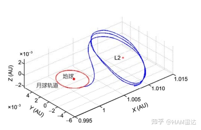 - 从月球逃逸。设计采用两次加速控制的方式, 第一次加速控制, 卫星进入近月点约 100 km, 远月点约 3565 km, 周期约 5.3 h 的椭圆过渡轨道. 第二次加速, 卫星逃逸, 进入飞向日-地 L2 点的转移轨道。