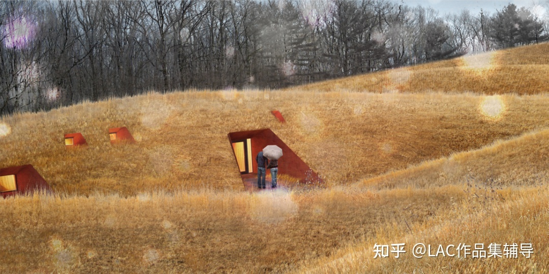 村舍形态是土地形态的强化。村舍群形成了一个阳光明媚的庇护微气候。每间小屋的开口,通过耐候钢门户切开地貌,将小屋内部与远处的草地连接起来,在平季和冬季静静地被动地收集太阳能,遮蔽开口并在夏季炎热时提供通风。