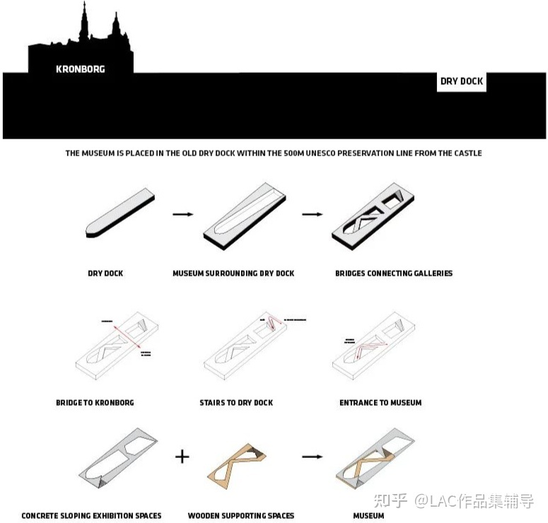 设计师BIG创始人Bjarke Ingels提到:原有的旧码头成为新博物馆的中心庭院,在保留其的过程中,其也成为了日光和空气的交换口。这样的处理,也尊重了附近的卡隆堡宫。我们设计了强大而具有吸引力的公共空间,博物馆即便在地面上看不见也能吸引游客