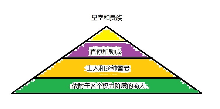 从知识分子群体的分布来看,中国的集权社会造成了知识分子呈金字塔形分布,国内绝大多数知识分子,按照科举成绩分成等级,形成士绅公卿等阶层,最底下的商人,虽然有些文化,但也要依附于这个体系内各个等级的知识分子。这个群体占有着国内绝大部分的土地和工商业资源,真正实现了富者即贵,贵者恒富,富贵一体。