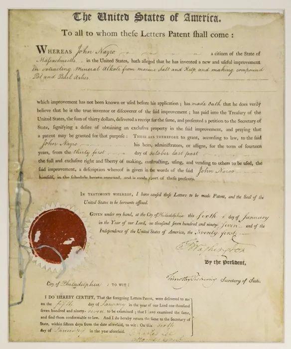 专利批准文件,从海盐和海带中提取矿物碱,并制钾盐的改良方法。专利权人:约翰纳佐罗。发明地:马萨诸塞州 获得专利时间:1797 年 1 月 6 日 专利批准号:145X