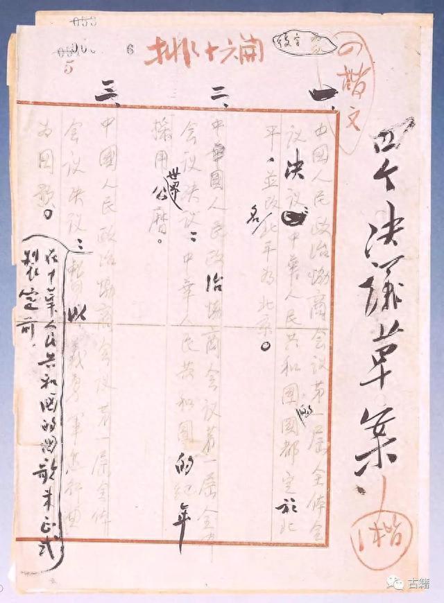 1949年9月27日,中国人民政治协商会议第一次会议全体会议关于国都、纪年、国歌、国旗的决议草案(毛主席修改稿)