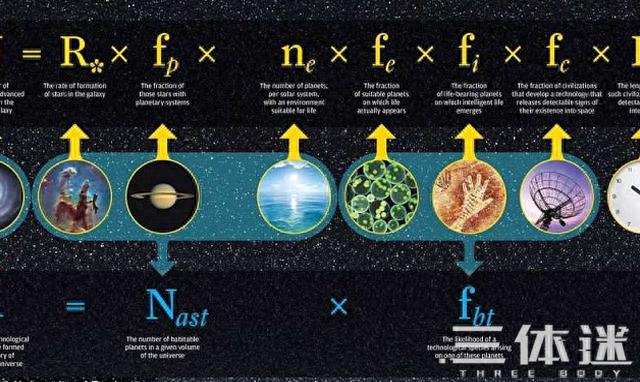 公式中的参数从左到右依次为:银河系内可能与我们通讯的文明数量、银河内恒星形成的速率 、恒星有行星的可能性、位于合适生态范围内的行星的平均数、以上行星发展出生命的可能性、演化出高智生物的可能性、这些高智生命能够进行通讯的可能性、这些高智文明的预期寿命。