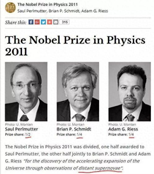 可是,万万没想到,1998年,两个科学团队同时发表了对Ia型超新星的光度和红移值测量的结果,这个结果告诉我们宇宙的膨胀在加速,领导这两个团队的科学家,在2011年获得了诺贝尔物理学奖。