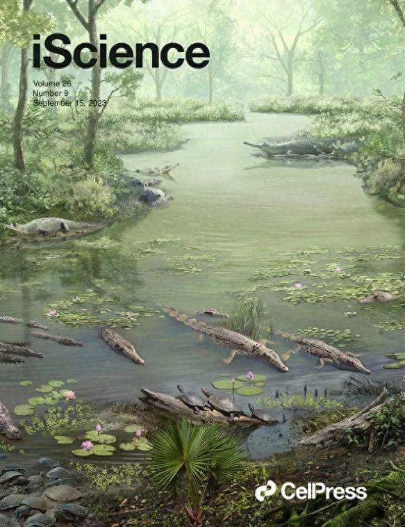 国际学术期刊《iScience》第 26 卷第 9 期的封面是一张治愈系风景画面,可以看到,茂密的森林草地中,一片宁静的池塘,好多鳄鱼吃饱了肚子,趴在浅水里休息。但你不知道的是,这张生态环境复原图的依据来自一堆鳄鱼的粪便化石。