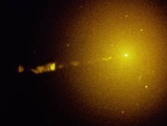 M87星系的直径达50万光年,而且它是个椭圆形的球状星系,比我们所在的银河系的总质量大多了。M87星系里共含12,000个球状星团,而我们银河系中只有100多个,其恒星总数量也在银河系恒星数量的100倍左右,这个星系的中心还有强大的射电流喷出,向外喷出的长度答案6000多光年。