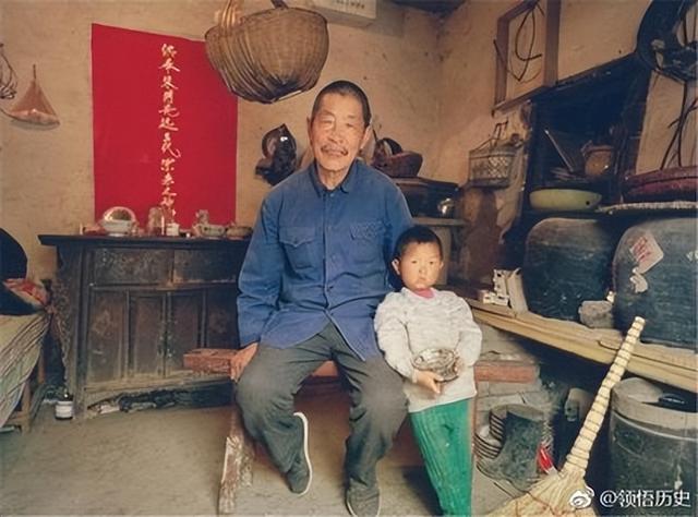 这是农村70、80年代农村生活的老照片,照片中是一位爷爷带着孙子
