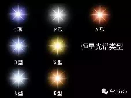 一颗恒星的颜色取决于它的温度:温度最高的恒星呈蓝白色,温度最低的显出橘红色。人们把恒星的光谱分成七种类型,分别是O、B、A、F、G、K和M,其中O型是最热的一类星,M型是相对最冷的一类星,同时每一种谱型还分为从0到9十个等级(从热到冷);太阳的谱型属于G2型。