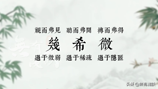 素朴之所以在这里提出这个问题,是因为「视而弗见,名曰幾;听而弗闻,名曰希,抟而弗得,名曰微」,这段话也有异曲同工之处,首先这个「视而弗见,名曰幾」,也就是说我们去看的时候却看不见,正是因为它的动态过于微弱,弱到几乎要殆尽,所以,想看却微弱到看不见,名曰幾,而当我们想要去听得时候又听不到,是因为它的声音太过于稀疏,所以,想听却稀疏到听不见,名曰希,那我们就试着触摸一下吧,仍然是难以触碰到的,因为它非常隐蔽,所以,想触碰却好像藏匿起来了,名曰微。