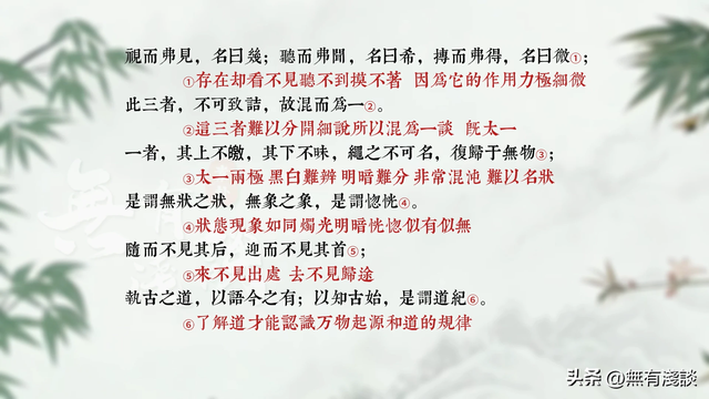 所以这里我们要特别注意,前面第一章我们说过道体本身是虚无混沌、无形无相的,但是这一章老子已经展开来说太一了,那么,无论是素朴解说版本的「幾、希、微」还是其他版本的「夷、希、微」,很多人把这个看不见、听不到、摸不着,解释成无形,无声,无相,这是绝对错误的。