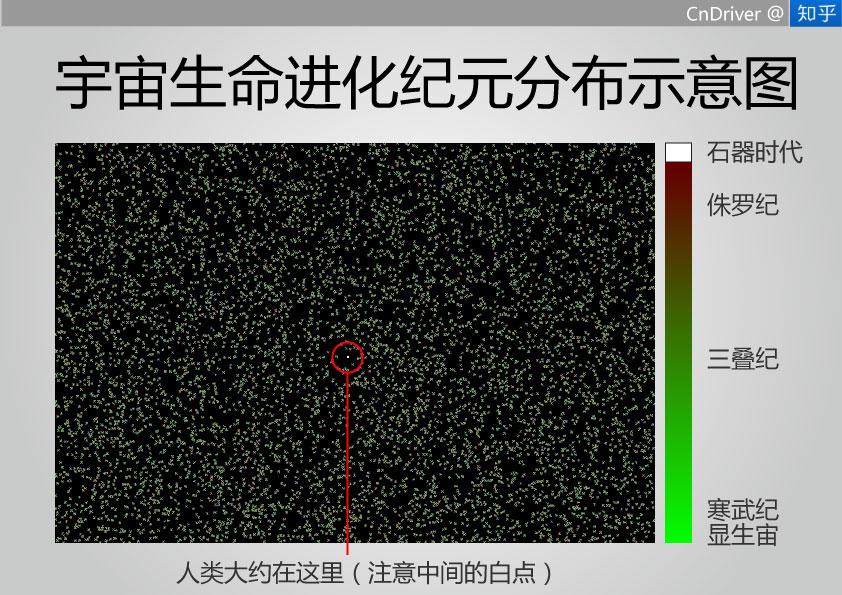 群星浩瀚,各具千秋。当一个智慧种族在宇宙中航行,所遭遇的星球定然是按概率大小随机分布,而不会把一堆智慧文明都挤在一起,也不会把一堆同龄行星堆在一起……这必然意味着任何地外文明在发现我们之前,他们经过适合居住的星球将至少在亿颗以上。这就如同你从一游泳池彩票里寻找百万大奖的过程:最开始先发现一大堆百元小奖、一小堆千元彩票、然后找到了几十张万元彩票,几张十万元彩票,最后才能找到一张百万元级别的大奖。如果把我们的宇宙画一张图来标识这其中所有有生物的星球的进化纪元,那么这张图大概会是类似于这样: