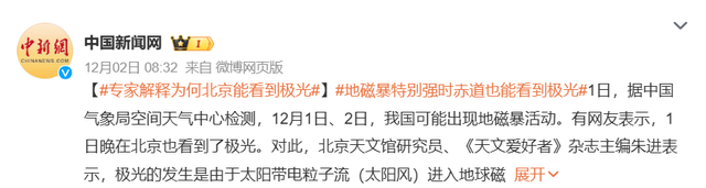 极光常见于高磁纬度地区,但近期地磁暴较强,使得我国北方地区出现了罕见的极光现象。
