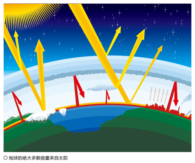 地球不同纬度接受太阳辐射能量的差异造成了从赤道到两极的地表温度和大气温度差异,而地球海陆分布差异也带来不同区域吸收太阳辐射能量的差异,占地表面积71%的海洋吸收了大部分的太阳辐射能,成为地球大气最重要的热源。