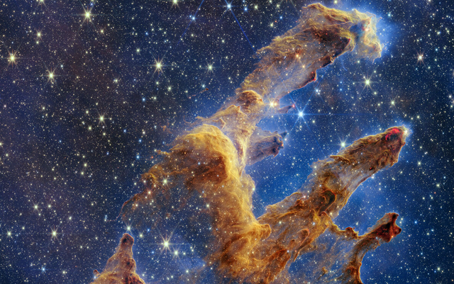 韦伯望远镜拍摄到的创生之柱,不同让我们看到了如同巨柱的星云,还让我们第一次看到了保护恒星诞生的茧,蒸发气体球的存在,恒星诞生于星云,诞生时它会产生强烈的辐射,这样的辐射会吹散星云(哈勃拍摄的支柱的顶端我们可以清晰的看到辐射对星云的侵蚀)。但仔细的观察,我们会发现,在这强烈的辐射中有一些如同手指的小节支,它们依然屹立于辐射之中。韦伯望远镜是红外波段的望远镜,具有强大的穿透力,在韦伯望远镜拍摄的照片中,我们能够看到很多厚厚的结块,这些都是分子云密集的区域,而且我们还能够看到一些红色的波纹,这些事恒星形成时发出的喷流和周围分子云相互作用的现象,恒星诞生之处,两极会发出喷流,射流刺破分子云会形成一种叫做赫比格哈罗的天体,它们会与周围分子云发生相互作用从而点亮分子云,形成美丽的发射星云。