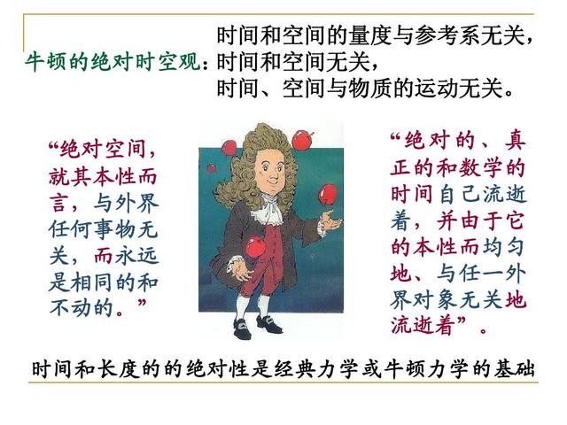 其实这就是牛顿力学体系的基础:绝对时空观,强调时间和空间是绝对的,两者是孤立存在的,对于任何人来讲,时间和空间都是一个绝对不变的量,时间都会以绝对不变的速度流逝。