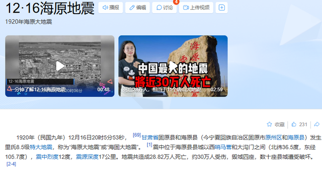 1920年12月16日,同样是发生在夜间,我国甘肃海原县发生了8.5级特大地震,造成28.82万人死亡,近30万人受伤,震级之大,其余震都影响世界三年之久。