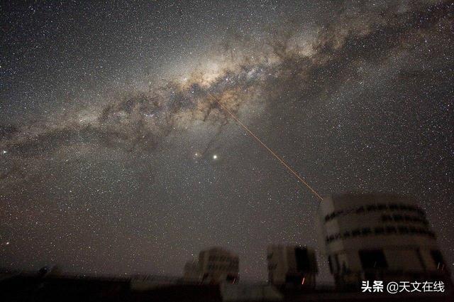图解: 在帕瑞纳天文台的夜空中观赏到的 银河系的核心 (激光为望远镜创造出一颗导引星)