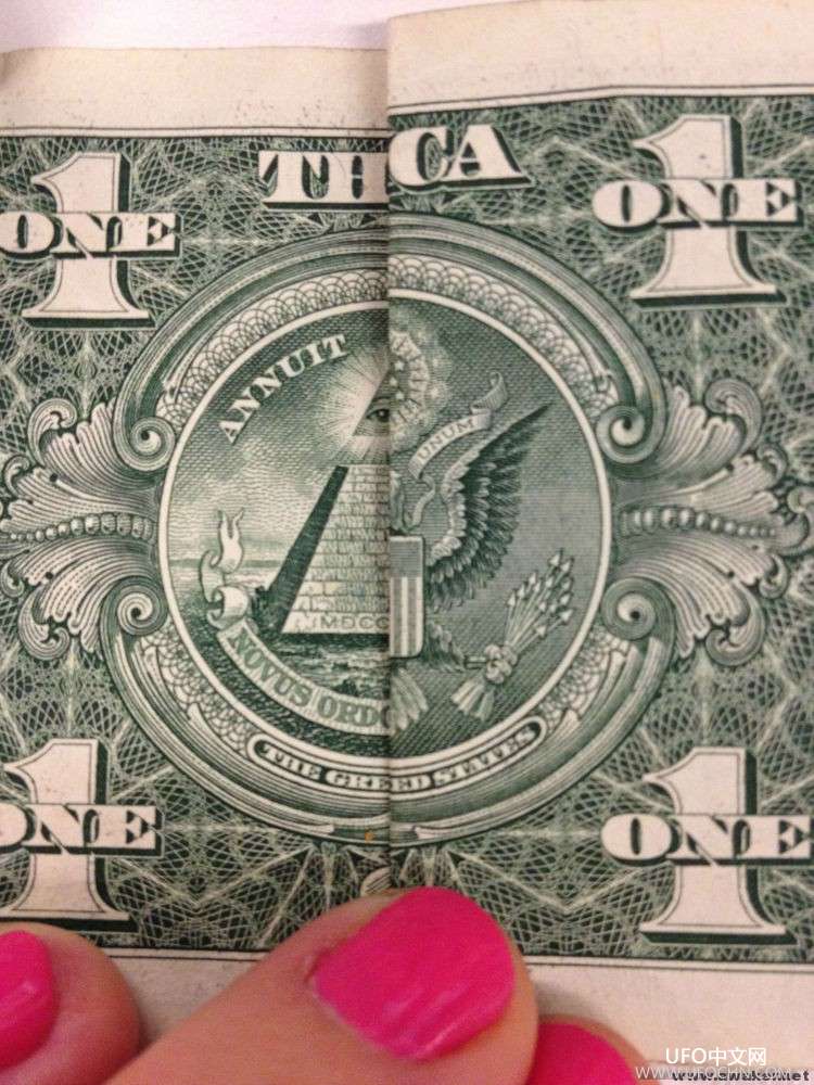 1美元的折叠两次可以看到原来的“美国官方大印章”字样(The Great Seal Of The United States)变成了“贪婪的国家”(The Greed States)
