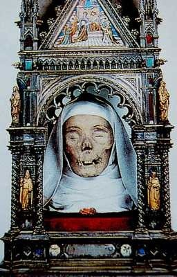 圣凯瑟琳的首级 圣凯瑟琳是天主教的圣人和欧洲的主保,曾梦见耶稣跟她结婚,耶稣还将儿时割下的包皮送给了她。圣凯瑟琳在33岁时因为中风死于罗马,之后圣凯瑟琳出生地锡耶纳的人民想将其遗体偷回去供奉,结果发现根本无法全部带走,只有取下她的首级装在麻袋里带走。但随后被偷窃者盗走,而在其逃跑的途中又被警卫所抓捕。在警察打开麻袋后并没有发现凯瑟琳的首级,却是一袋玫瑰花瓣。