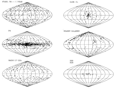 上左:528颗邻近恒星的分布;上右:160个河内球状星团的分布;中左:1145个河内行星状星云的分布;中右:276个邻近星系的分布;下左:233个河外射电源的分布;下右:软伽玛射线再现源(圆圈)与河内X射线暴(黑点)的分布。以上均采用银道坐标系。